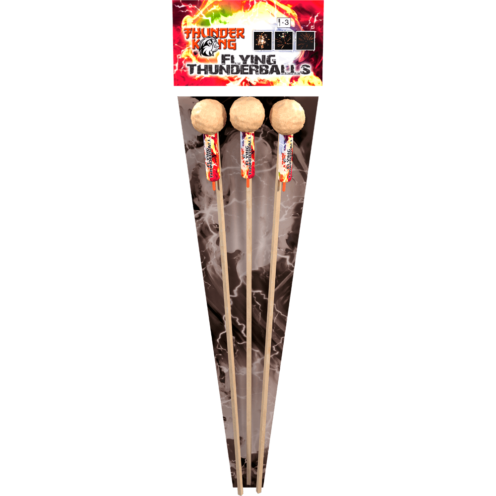 nFlying Thunderballs zijn drie spectaculaire raketten, elk met een enorme explosie! Van de gloeiende Crown tot de gouden Coco tot de Crackling Strobes. Maximale effecten!
