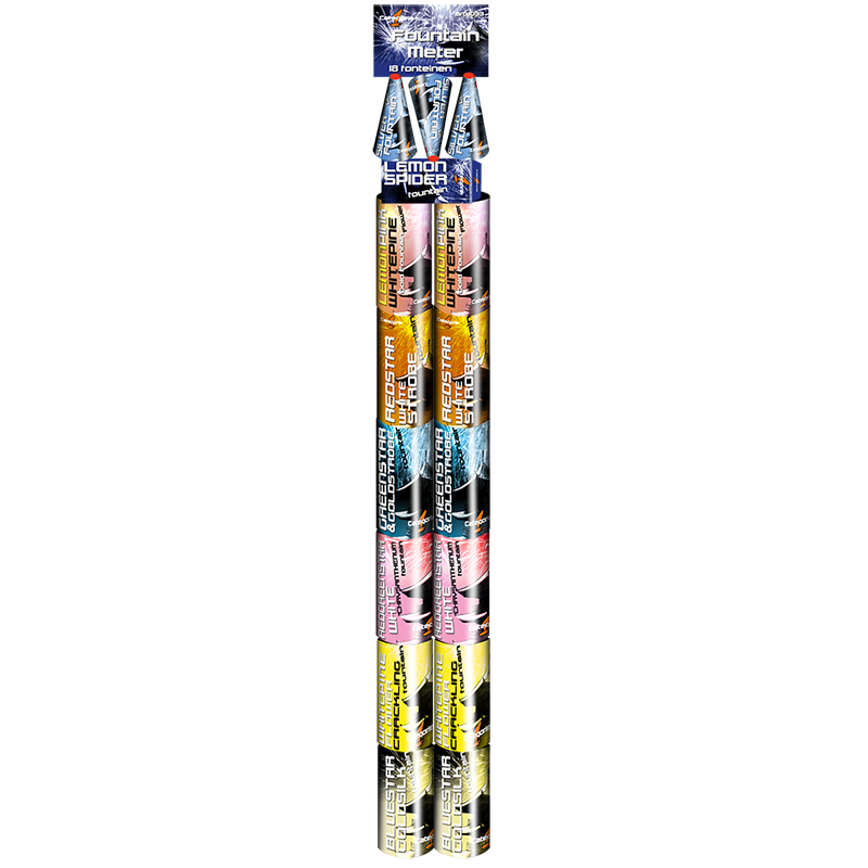 Fountain Meter, een meterpakket assortiment met geweldig sierlijke Categorie1-fonteinen. In dit assortiment zitten 18 fonteinen met verschillende siereffecten. 3 stuks Silver-kegel fonteinen, 1 stuk Lemon-Spider fontein, 2 stuks Redstar-Whitestrobe fonteinen, 2 stuks Greenstar-Goldstrobe fonteinen, 2 stuks Red-Greenstar fonteinen, 2 stuks Whistpine-Flower fonteinen en 2 stuks Bluestar-Goldsilk fonteinen.