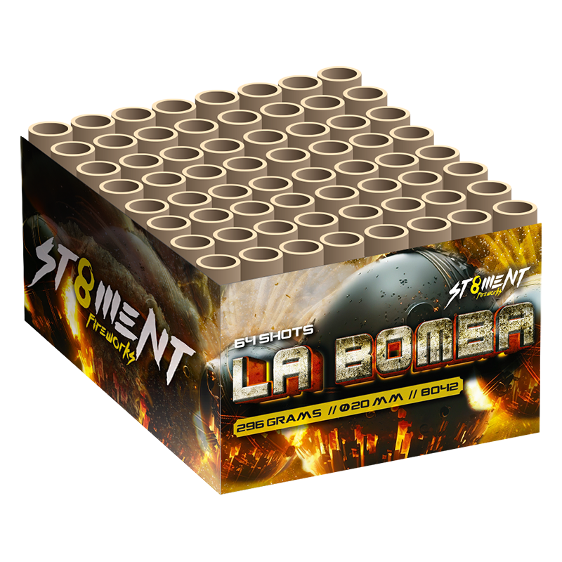 La Bomba! Knallend en fluitend het nieuwe jaar in? Dan is deze La Bomba-cake jouw perfecte keuze! Gebaseerd op de oude Estallar van St8ment schiet deze cake 64 schoten in heftige salvos van siervuurwerk en fluit in een hoog tempo de hemel in! Topper van de bovenste plank! n nProductinformatie: nType product: Siervuurwerk nEffect product: Cake nTube diameter: 20mm nFanshape: Nee nClassificatie: CAT.F2 nMinimale leeftijd: 16 jaar nLegaal afsteken op: 31 december nVeiligheidsafstand: minimaal 8 meter nGeschikt voor smalle straten: Ja nGeschikt in Gemeente vuurwerkverbod: Nee La Bomba 64 shots 20mm Goedkoop vuurwerk kopen bij Vuurwerkwinkel Amsterdam