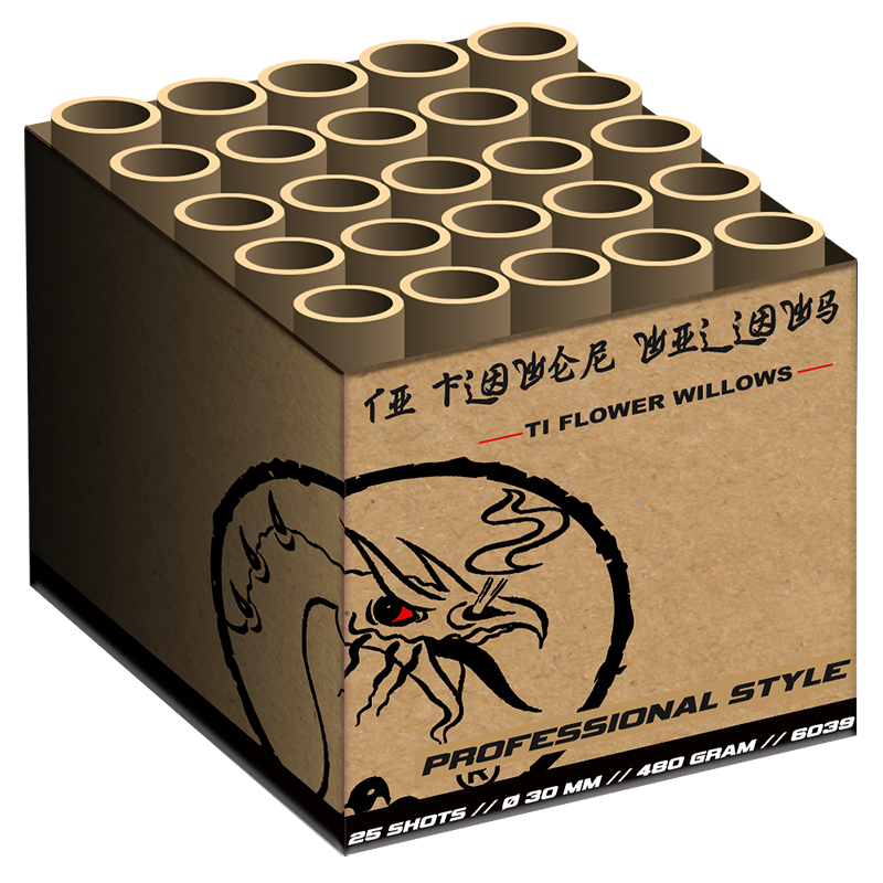 Ti Flower Willows. Dit is een siercake met de maximale tubesize van 30mm. Hiermee schiet deze cake geweldig mooie gouden brocade crowns, brocade palm en ti flower willows af. Een geweldige combinatie! n nProductinformatie: nType product: Siervuurwerk nEffect product: Cake nTube diameter: 30mm nFanshape: Nee nClassificatie: CAT.F2 nMinimale leeftijd: 16 jaar nLegaal afsteken op: 31 december nVeiligheidsafstand: minimaal 8 meter nGeschikt voor smalle straten: Ja nGeschikt in Gemeente vuurwerkverbod: Nee Ti Flower Willows 25 shots 30mm Goedkoop vuurwerk kopen bij Vuurwerkwinkel Amsterdam