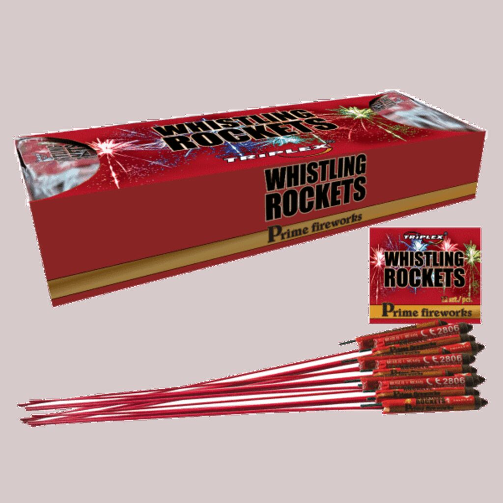 n144 vuurpijlen van Triplex met fluiteffect en harde knal.nDit product is verboden in Nederland.