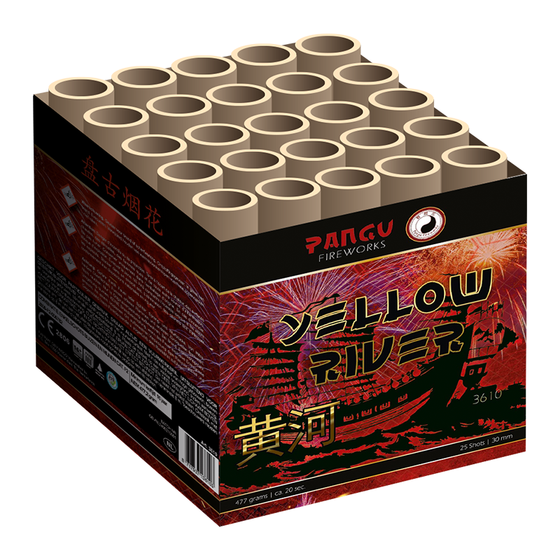 De Yellow River, vertaald Gele Rivier, wordt ook wel de bakermat van de Chinese beschaving genoemd. Deze Yellow River van Pangu Fireworks kunnen we ook wel de bakermat van vuurwerkpotten noemen. 25 schoten met een 30mm tubesize schieten de mooiste glitterpalmen gecombineerd met waterblauwe parels en vuurrode robijnen. Dit is DE TOPPER voor iedere vuurwerkfanaat!